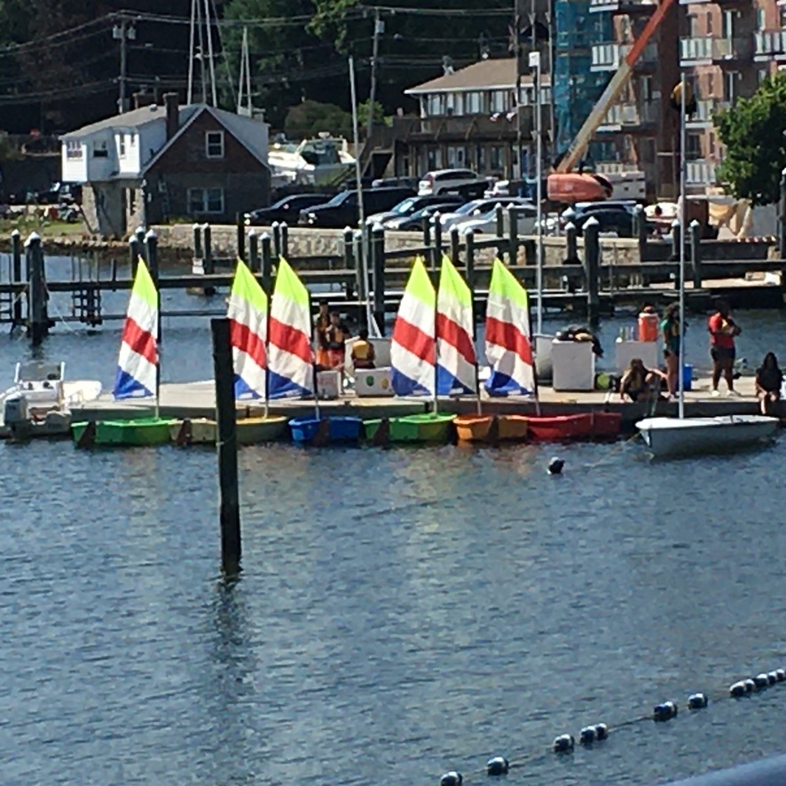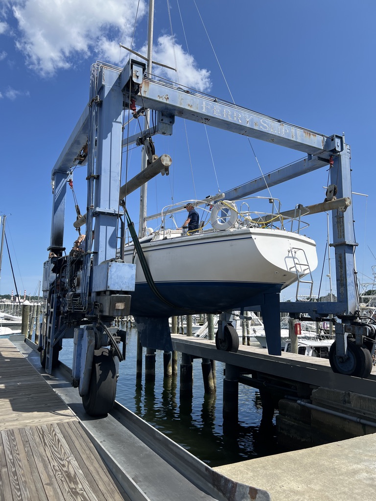 Today was the big day! They put the boat on a trailer and towed her out of her little spot in the back, then picked her off the trailer with the travel lift and set her down in the water. What a feeling! They very kindly let her float on the straps while I frantically