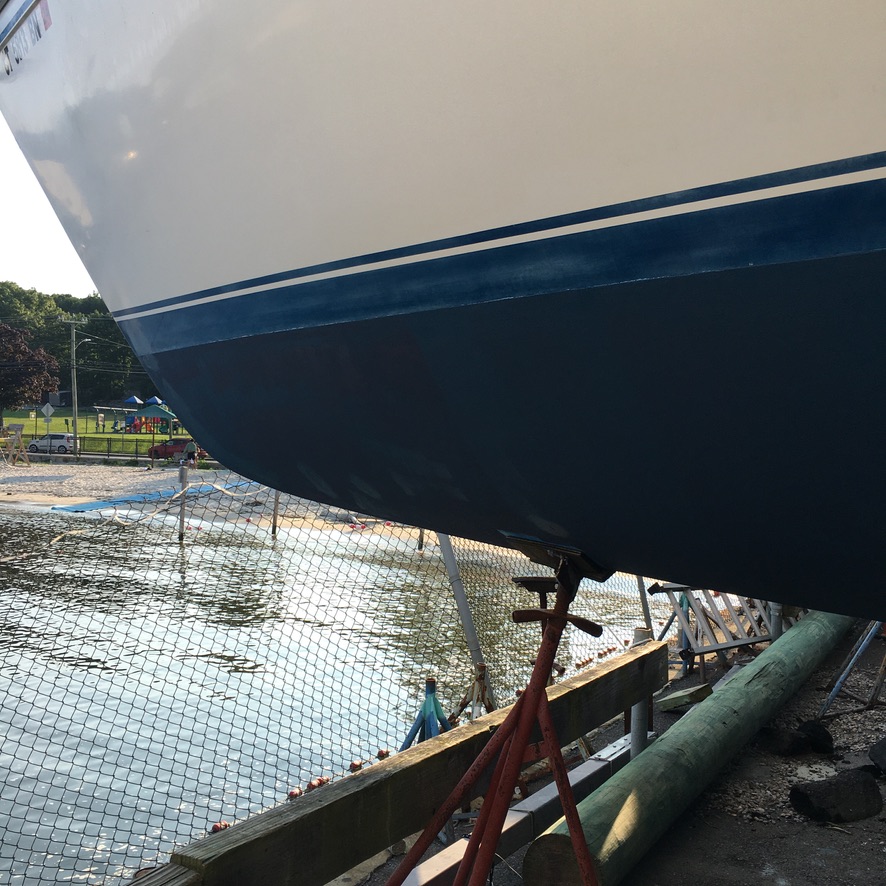 Today was bottom prep day. She looks so nice with her bottom painted, new anode and cold galvanized on the prop and shaft!!